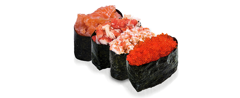 філадельфія з вугром, філадельфія з лососем, каліфорнія в кунжуті з сніговим крабом