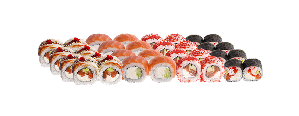 Рис, норі, лосось, вугор, тунець, вершковий соус, ікра тобіко, огірок, авокадо, унагі соус, кунжут, чорнила каракатиці