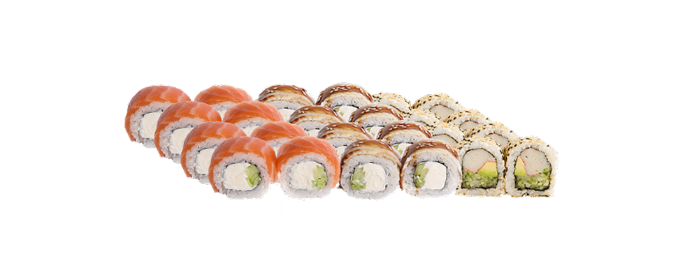 рис, норі, лосось, вугор, крем сир, ікра тобіко, огірок, унагі соус