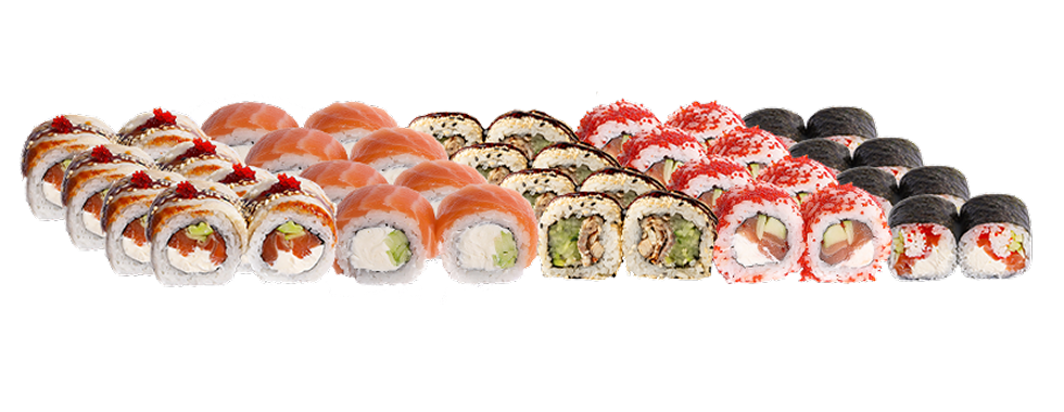 рис, норі, лосось, вугор, тунець, вершковий сир, ікра тобіко, огірок, авокадо, унагі соус, кунжут, чорнило каракатиці