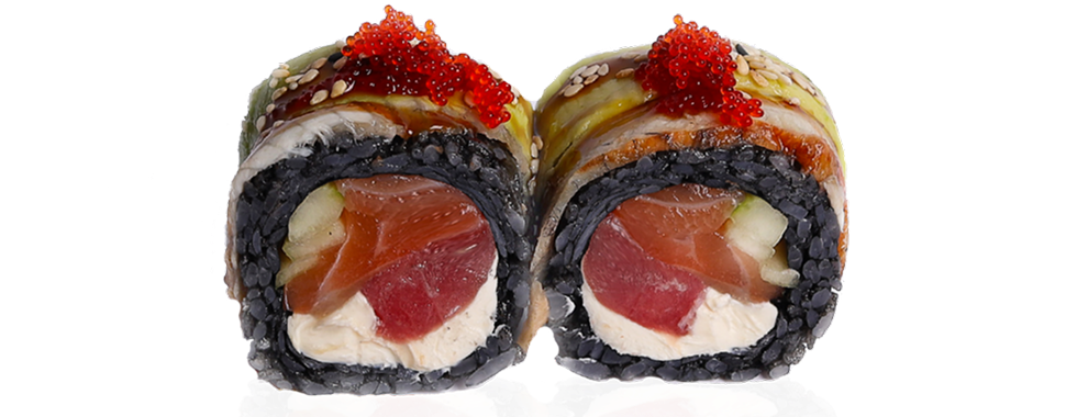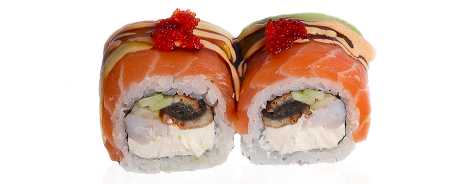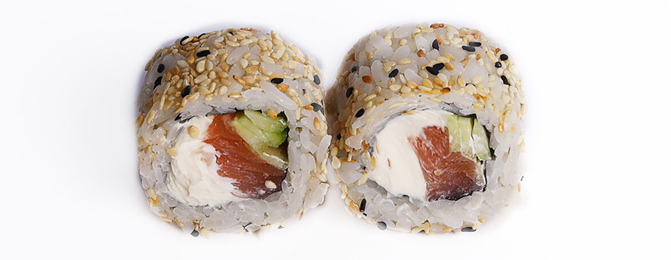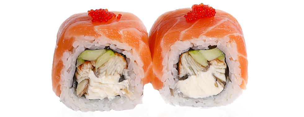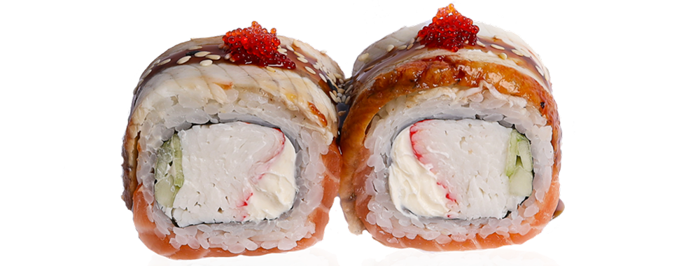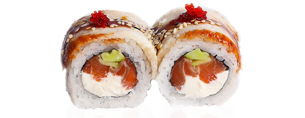 рис, норі, вугор, лосось, крем сир, огірок, унагі соус, кунжут