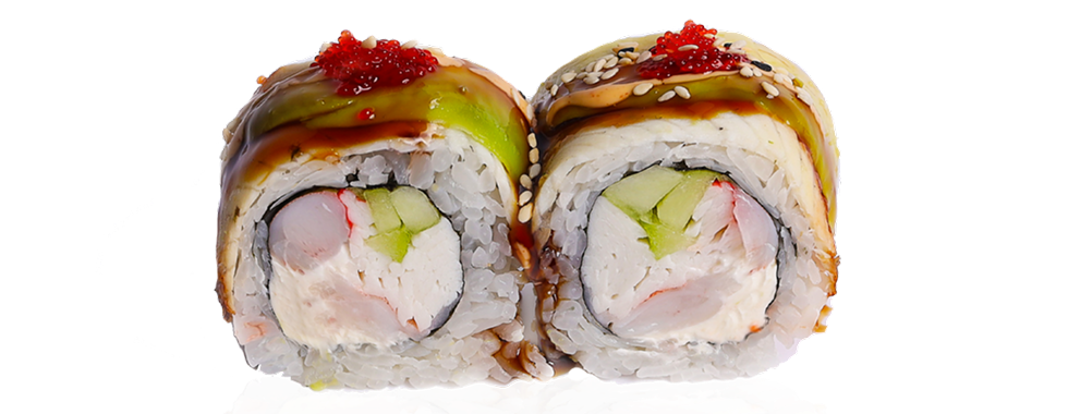 рис, норі, креветка, вугор, сніжний краб, вершковий сир, ікра тобіко, авокадо, унаги соус, кунжут